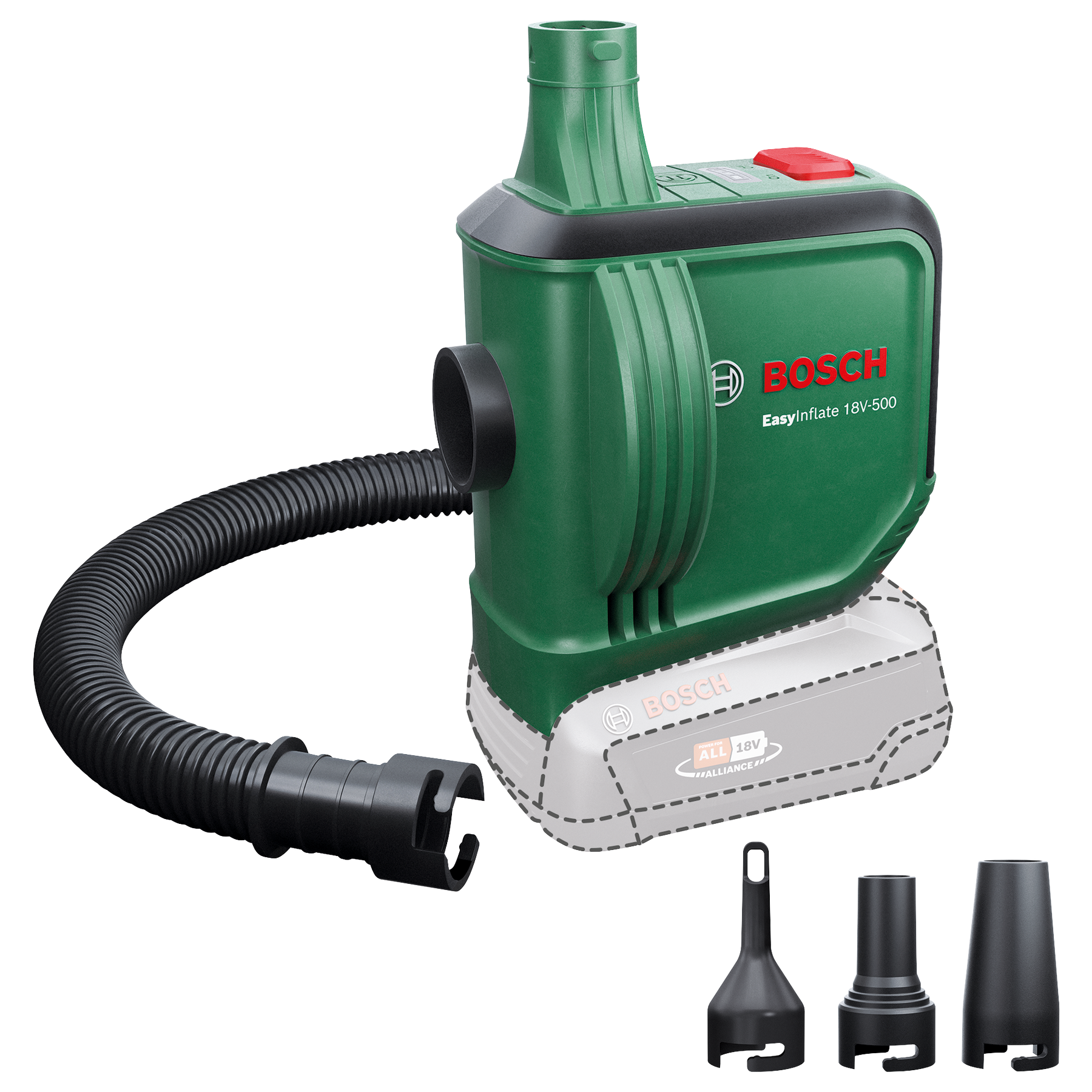 Akumulátorový kompresor Bosch EasyInflate 18V-500 s maximálnym prietokom vzduchu 530 l/min prináša novú úroveň rýchlosti a komfortu pri nafukovaní a vypúšťaní vzduchu z bazénových hračiek, nafukovacích lodí, vzduchových matracov a iných objemných predmetov. Hadica dĺžky 50 cm a jednoduchý vypínač umožňujú komfortné používanie. Tento kompaktný kompresor sa dodáva s tromi dýzami na ventily rozličných veľkostí a úložnou taškou na jednoduché prenášanie k bazénu, jazeru alebo kempingu. Tento objemový kompresor patrí do systému 18V POWER FOR ALL. Jeden akumulátor pre všetko náradie 18V POWER FOR ALL.