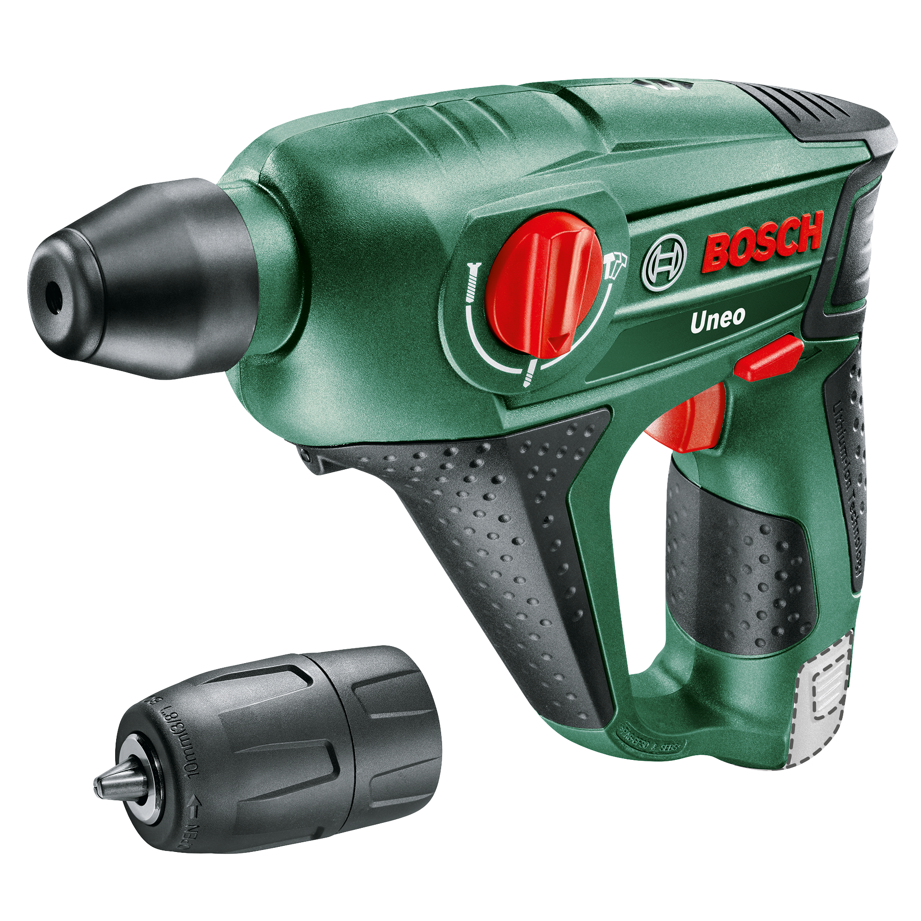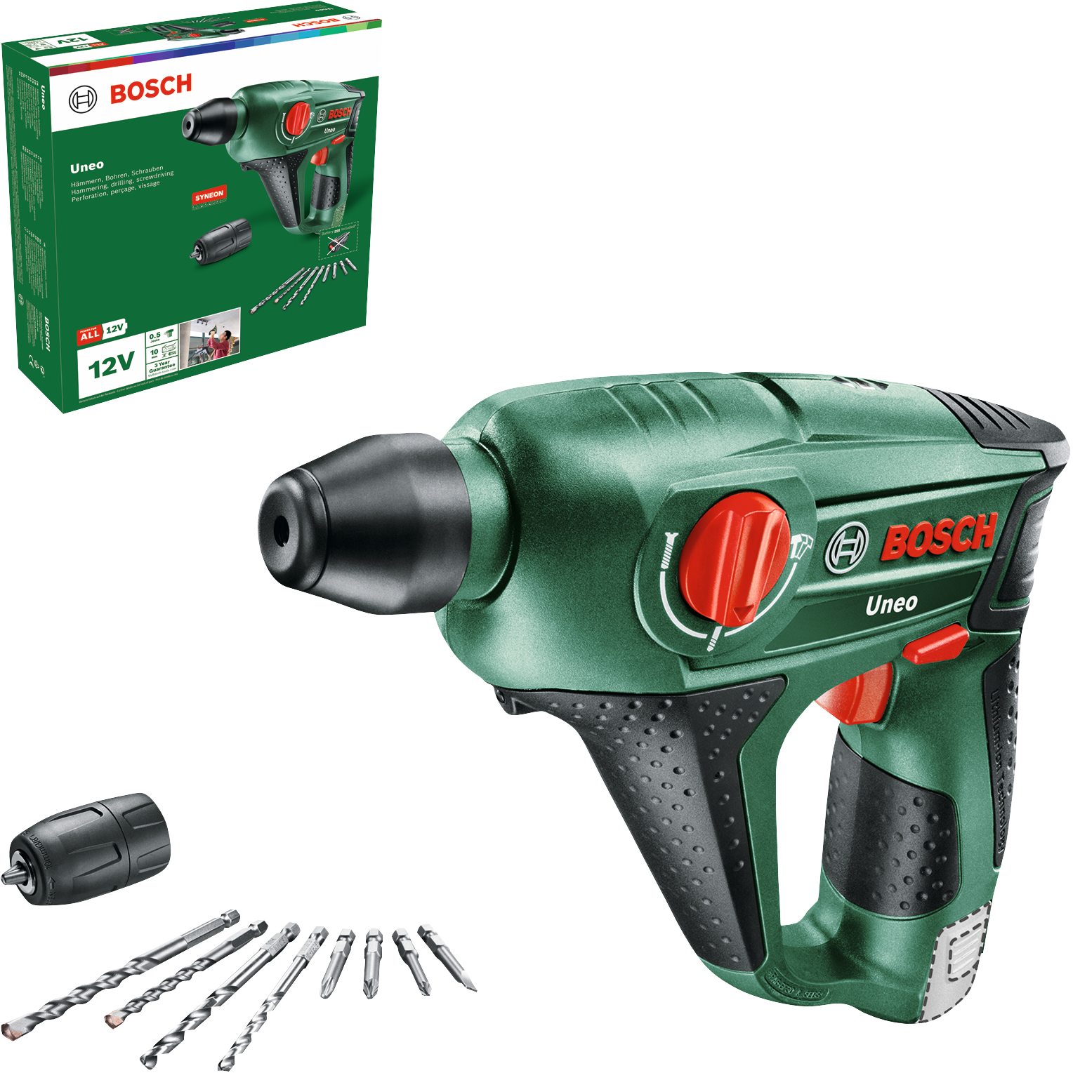 Univerzálne akumulátorové vŕtacie kladivo Uneo je navrhnuté na vŕtanie, vŕtanie s príklepom a skrutkovanie do betónu, muriva, kovu, dreva a obkladačiek. Pneumatický príklepový mechanizmus Bosch a výkonný motor umožňujú ľahké a rýchle vŕtanie do 10 mm do betónu. Je vybavené skľučovadlom systému SDS quick na intuitívne ovládanie a rýchlu výmenu všetkých 1/4" šesťhranných a SDS vrtákov v priebehu 3 sekúnd. Dvojrýchlostná prevodovka umožňuje voliť medzi vysokým krútiacim momentom alebo otáčkami na dosiahnutie vynikajúceho výkonu v akejkoľvek aplikácii alebo materiálu. Výkonné, kompaktné na prácu v stiesnených priestoroch a ľahké, vážiace len 1,2 kg, je jedinečné náradie pre akúkoľvek prácu. Toto náradie patrí do systému 12V POWER FOR ALL. Jeden akumulátor pre všetko náradie 12V POWER FOR ALL.