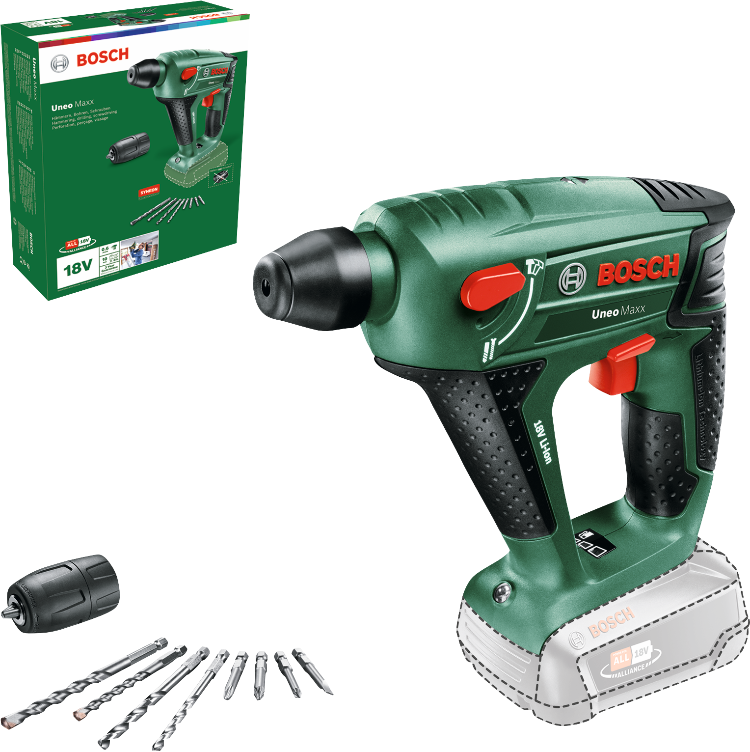 Výkonné a kompaktné akumulátorové vŕtacie kladivo 3 v 1 Uneo Maxx je navrhnuté na najnáročnejšie príklepové vŕtanie, vŕtanie a skrutkovanie do betónu, muriva, kovu, dreva a obkladu. Pneumatický príklepový mechanizmus Bosch a silný motor umožňujú ľahké a rýchle vŕtanie do 10 mm do betónu. Je vybavené skľučovadlom systému SDS quick na intuitívne ovládanie a rýchlu výmenu všetkých 1/4" šesťhranných a SDS vrtákov v priebehu 3 sekúnd. Tento 1,4 kg ľahký a kompaktný silák sa komfortne ovláda v stiesnených priestoroch, zvládne akýkoľvek projekt, či už vŕtanie do betónu alebo presnú skrutkovanie do dreva, s ľahkosťou. Toto náradie patrí do aliancie POWER FOR ALL ALLIANCE. Jeden akumulátor možno používať s množstvom náradia rozličných značiek.