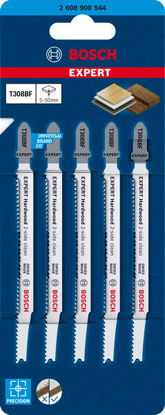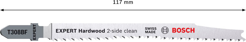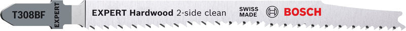 List priamočiarej píly Bosch EXPERT ‘Hardwood 2-side clean’ je vyrobený z dvoch kovov – je to pás kovu na rýchle rezanie spojený s pružnou oceľovou čepeľou, takže vzniká silný a flexibilný materiál. Vďaka tomu je dostatočne robustný na rezanie kuchynských pracovných dosiek z laminovanej drevotriesky alebo tvrdého dreva. Je dostupný na priame rezy bez ostrapov (T308BF) a pre obzvlášť presné uhlové rezy bez ostrapov (T308BFP)