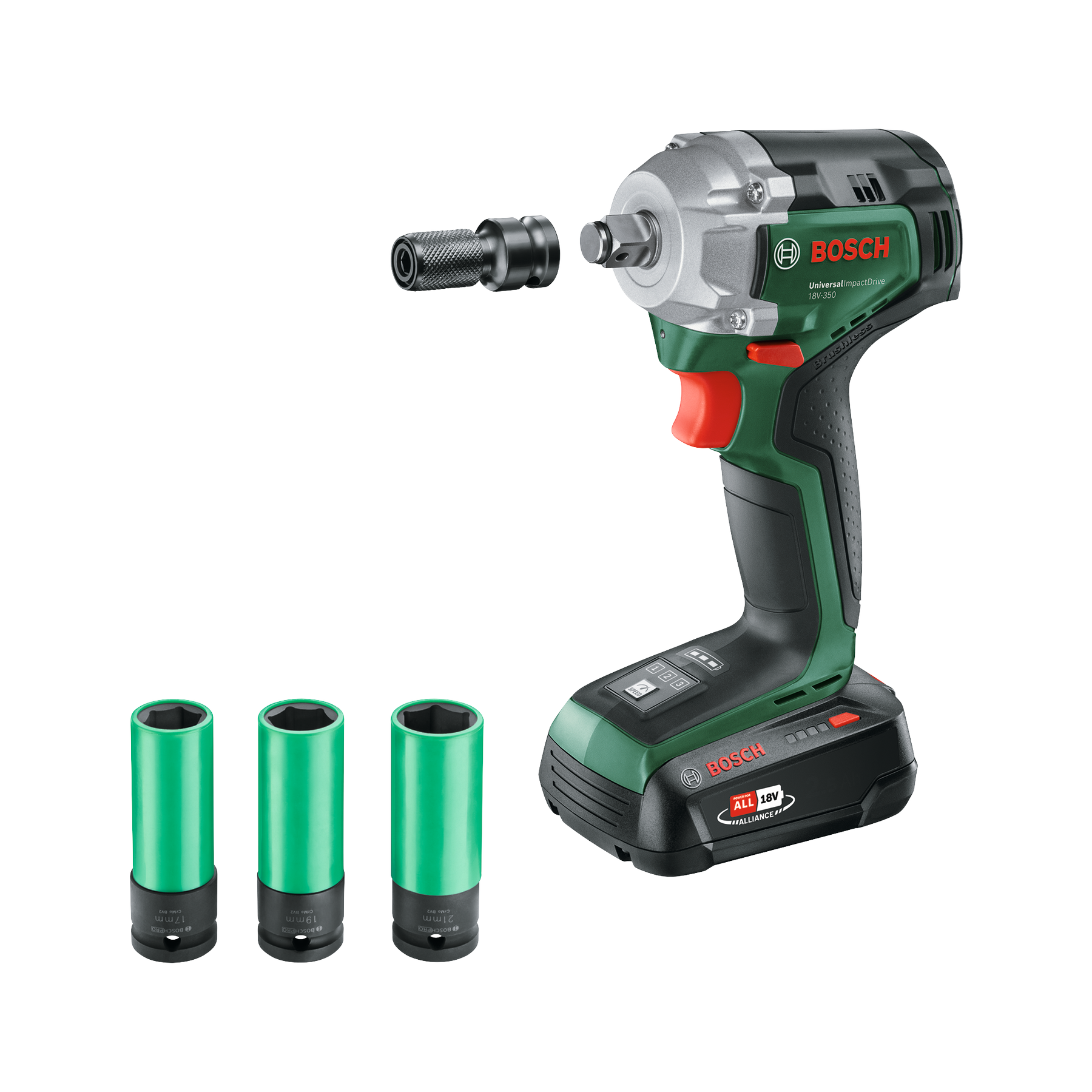 Při výměně kol vám Bosch UniversalImpactDrive 18V-350 usnadní život. Tento akumulátorový rázový utahovák má 3 nastavení otáček a krouticího momentu, poskytuje max. točivý moment 350 Nm a max. 3 400 rázů za minutu. Díky tomu je výkonný a všestranný při práci se zatvrzelými maticemi kol, odstraňuje staré nebo rezavé šrouby nebo snadno utahuje velké šrouby do dřeva. Tento rázový utahovák s 1/2" vnější čtyřhrannou hlavou lze vybavit řadou kompatibilních nástavců, takže je vhodný pro různé úkoly. Technologie bezuhlíkového motoru zajišťuje vyšší výkon a delší životnost nástroje. Rázový utahovák se díky své kompaktní konstrukci snadno přenáší a je ideální pro práci nad hlavou. Vestavěná elektronika Bosch Syneon chrání nářadí i akumulátor. Toto nářadí patří do systému 18V POWER FOR ALL. Jeden akumulátor lze používat s veškerým nářadím 18V POWER FOR ALL.