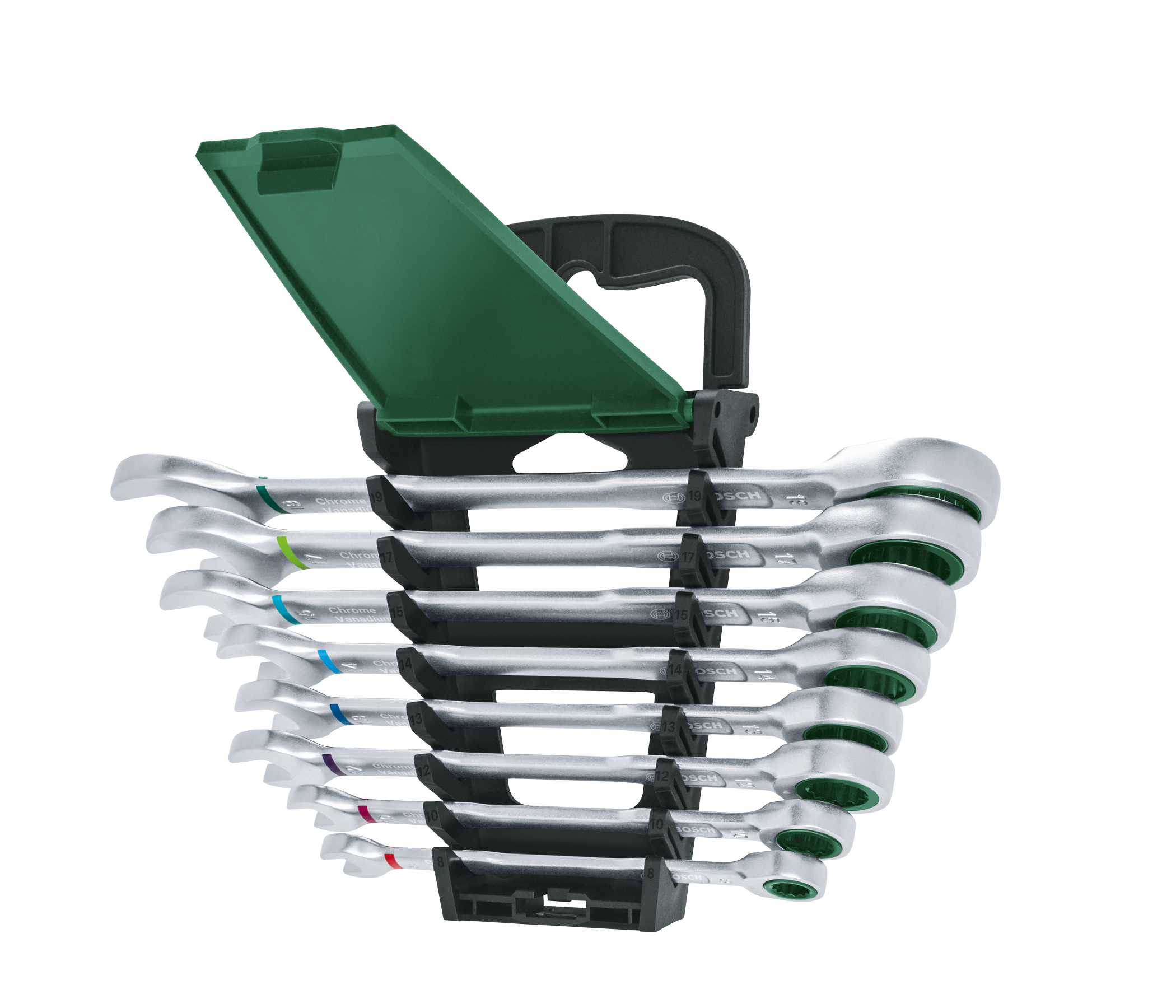 8-dielna súprava kombinovaných kľúčov s račňou Bosch je nevyhnutým univerzálnym pomocníkom pri rozličných opravárenských a údržbových prácach kategórie DIY. Každé náradie je špičkovou kombináciou vidlicového kľúča a očkového kľúča s račňou na rozmanité práce a prácu v stiesnených priestoroch. Časti kľúča sú vyrobené z odolnej vysokokvalitnej chróm-vanádiovej ocele s niklovou a saténovou povrchovou úpravou zaručujúcou vyššiu odolnosť proti hrdzi. Každý račňový kľúč má 72 zubov, pracovný uhol 5 stupňov a dosahuje vysoký krútiaci moment prekračujúci o 20 % normu DIN. S ohľadom na maximálny komfort a rýchly výber sú kľúče farebne rozlíšené a uložené v kompaktnom úložnom puzdre so skladacou rukoväťou na ľahšie nosenie.
