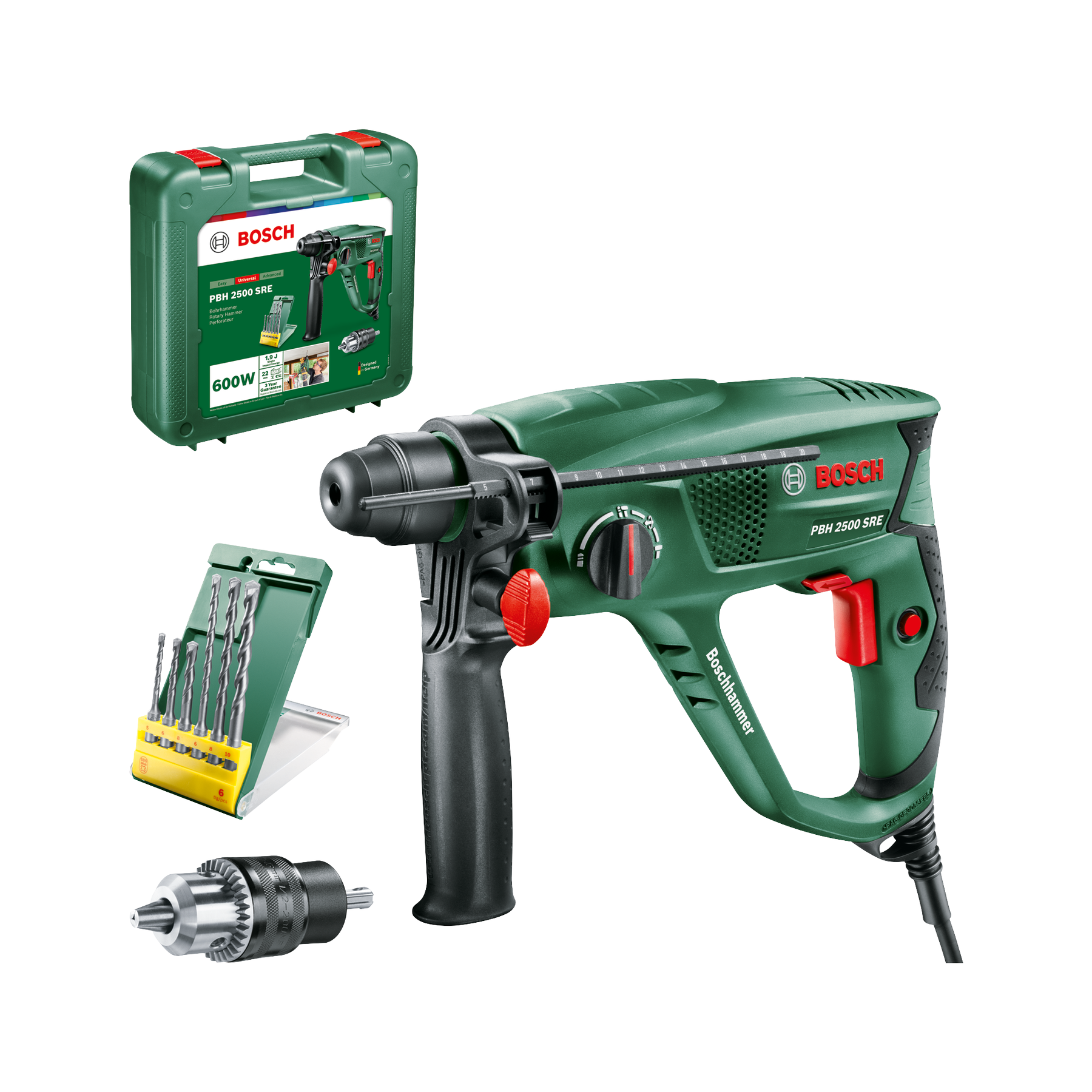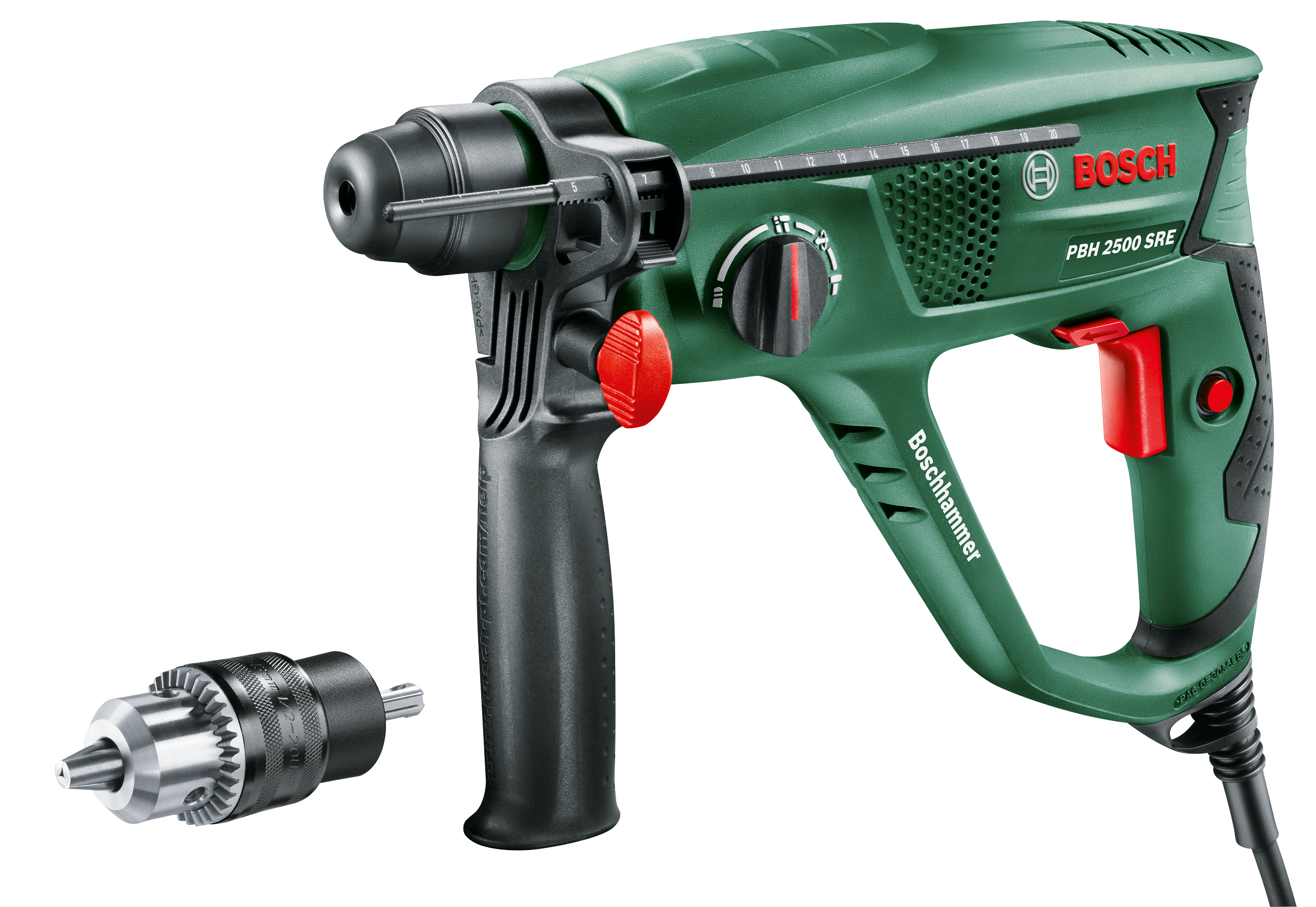 Elektrické sieťové vŕtacie kladivo PBH 2500 SRE je perfektné na ťažké vŕtanie, vŕtanie s príklepom a sekanie do betónu, muriva, obkladačiek, dreva a kovu. Jeho pneumatický príklepový mechanizmus Bosch s vysokou energiou úderu v hodnote 1,9 joulov je poháňaný silným 600 W motorom. Jeho skľučovadlo SDS plus umožňuje bezkľúčovú výmenu príslušenstva a umožňuje vloženie dodávaného adaptéra vŕtacieho skľučovadla na používanie stopkových vrtákov. Optimálny pracovný uhol zaručuje funkcia sekania so systémom Vario Lock, ktorá umožňuje 36 voliteľných polôh sekáča. Regulácia otáčok Bosch Electronic dodáva správne otáčky pre daný materiál prostredníctvom spúšte reagujúcej na tlak.