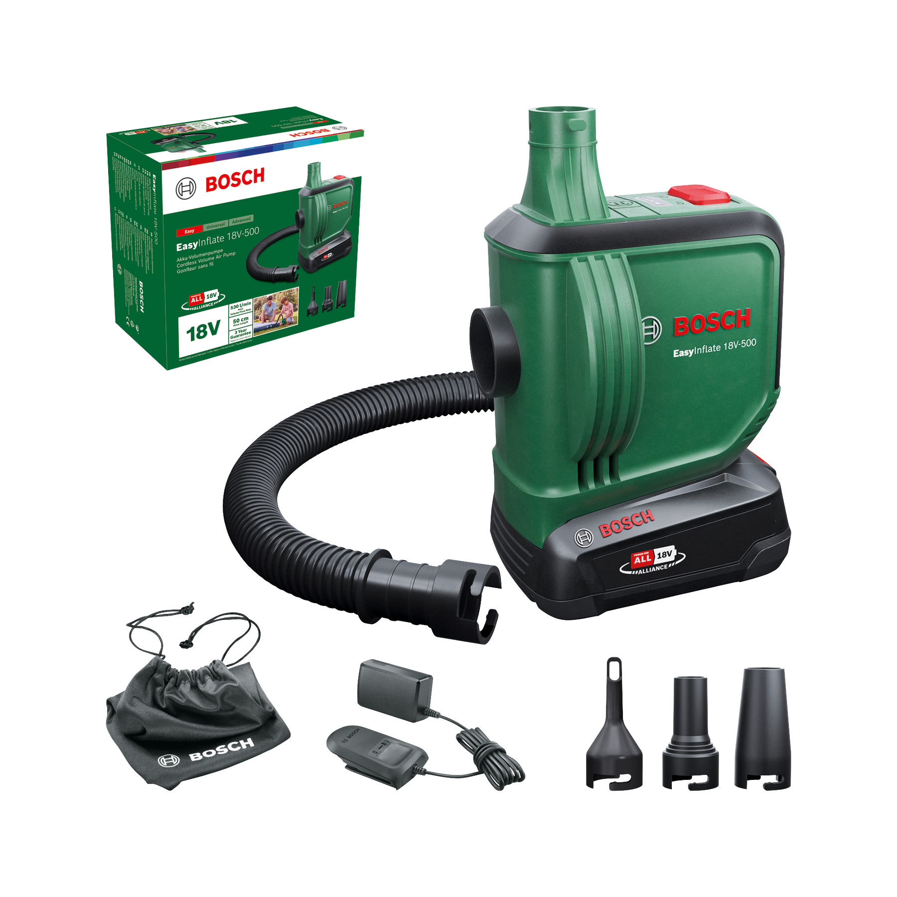 Akumulátorový kompresor Bosch EasyInflate 18V-500 s maximálnym prietokom vzduchu 530 l/min prináša novú úroveň rýchlosti a komfortu pri nafukovaní a vypúšťaní vzduchu z bazénových hračiek, nafukovacích lodí, vzduchových matracov a iných objemných predmetov. Hadica dĺžky 50 cm a jednoduchý vypínač umožňujú komfortné používanie. Tento kompaktný kompresor sa dodáva s tromi dýzami na ventily rozličných veľkostí a úložnou taškou na jednoduché prenášanie k bazénu, jazeru alebo kempingu. Tento objemový kompresor patrí do systému 18V POWER FOR ALL. Jeden akumulátor pre všetko náradie 18V POWER FOR ALL.