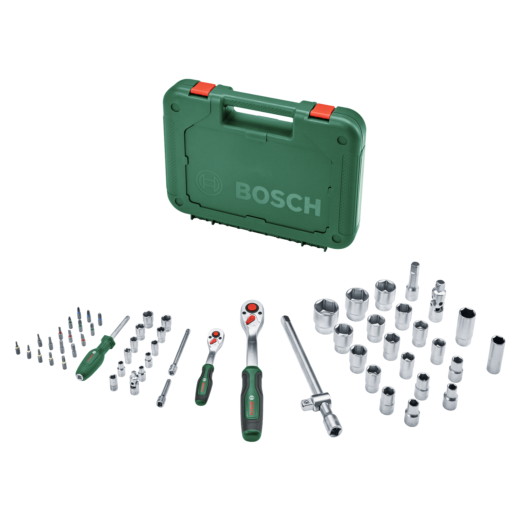 Táto vysokokvalitná 57-dielna račňová súprava Bosch 1/4″ a 1/2″ na široký rozsah automechanických a montážnych prác kategórie DIY je širokou, všestrannou súpravou. Táto súprava obsahuje račne 1/4″ a 1/2″ na vysoký uťahovací moment, 19 nástrčných kľúčov 1/2″, 10 nástrčných kľúčov 1/4″, 7 adaptérov a predĺžení, držiak 1/4″ a 18 farebne odlíšených skrutkovacích hrotov z ocele S2, a to všetko prakticky uložené v puzdre na prenášanie. Račňa 1/2″ zvládne silný uťahovací moment minimálne 768 Nm; račňa 1/4″ ponúka pozoruhodný uťahovací moment 93 Nm, ktorý minimálne o 50 % prekračuje štandard. Obe račne majú jemný 72-zubový mechanizmus vyrobený práškovou metalurgiou, ktorý poskytuje pracovný uhol 5° na lepší prenos sily aj v ťažko dostupných priestoroch. Pri použití vyššej sily zostáva nástrčný kľúč pevne na mieste vďaka praktickému zaisťovaciemu tlačidlu. Na rýchlu zmenu smeru uťahovania doľava alebo doprava slúži intuitívny prepínač na račniach. Ergonomické rukoväti rační sú vybavené mäkkými úchopovými plochami a poskytujú lepšie ovládanie a vyšší komfort.